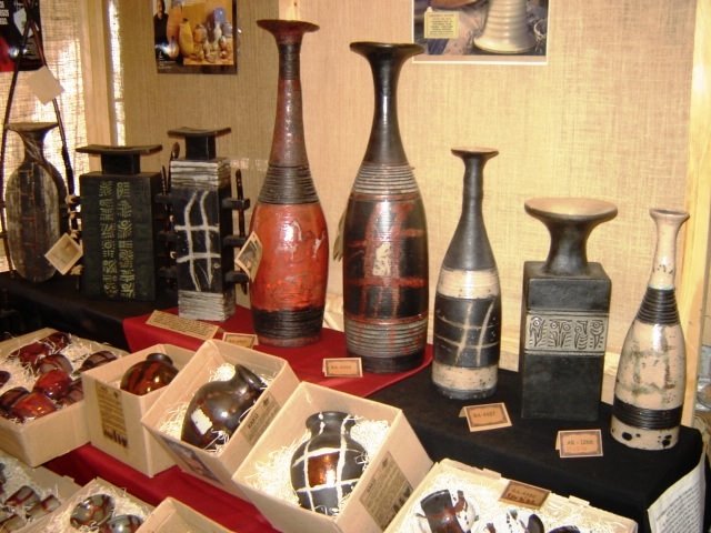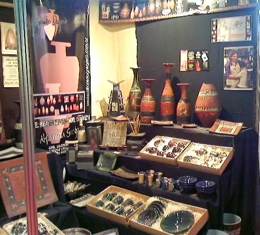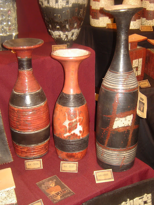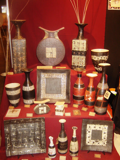 FORMATOS GEOMÉTRICOS EN BOTELLAS UTILITARIAS O DECORATIVAS. APLICACIONES DE ASAS CON CAÑAS. ESMALTES ARTESANALES CON SIMBOLOGÍA RECREADA DE PUEBLOS ORIGINARIOS EN REFLEJOS METÁLICOS. TÉCNICA DE ESMALTADO BAJO RELIEVEPLATO CENTRO DE MESA