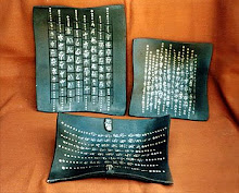 LÍNEA DE BANDAS. SIMBOLOGÍA RECREADA DE PUEBLOS ORIGINARIOS SOBRE ESMALTES CRAQUELADOS. TÉCNICA DE GRABADO BAJO RELIEVE CON HERRAMIENTAS CUNEIFORMES