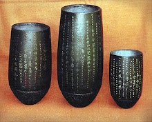 FORMATO GEOMÉTRICO EN BOTELLAS UTILITARIAS - DECORATIVAS. SIMBOLOS CALADOS CON TÉCNICA CUNEIFORME SOBRE BANDAS DE ESMALTE SANGRE DE BUEYPLATO - CENTRO DE MESA GIGANTE
