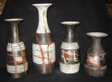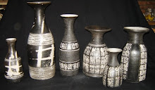 APLICACIONES DECORATIVAS DE ASAS Y CAÑA. SIMBOLOS ABSTRACTOS DE CREACIÓN DEL AUTOR, EN ESMALTES ARTESANALES SANGRE DE BUEY Y CRAQUELE. TÉCNICA DE MANCHASBOTELLAS GEOMÉTRICAS CON ASAS